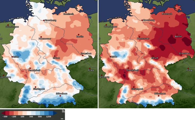 Abb. 1: Klimatische Wasserbilanz Deutschland links 1960-1990, rechts 2070-2100 RCP 8.5 mittlere Temperaturzunahme, Quelle: http://www.klimafolgenonline.com/