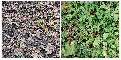 Abb. 4 - Detailansicht der Bodenvegetation im durch Freizeitaktivitäten stark belasteten Waldgebiet vor Beginn des Regenerationsversuches (links) und in einer Untersuchungsfläche ohne Bodenbearbeitung nach sieben Jahren Regeneration (rechts). Foto: H.-P. Rusterholz