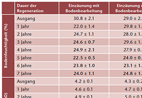 Der Eindringwiderstand und der Gesamtstickstoffgehalt des Oberbodens nahmen in den Probeflächen ohne Bodenbearbeitung mit fortschreitender Regenerationszeit ab und erreichten nach sieben Jahren dieselben Werte wie im unbelasteten Kontrollgebiet. In den Flächen mit Probebearbeitung wurden gleiche Werte wie im unbelasteten Kontrollgebiet schon nach fünf Jahren erreicht, wobei hier der Eindringwiderstand aufgrund der Bodenbearbeitung zunächst niedriger war als im Kontrollgebiet.