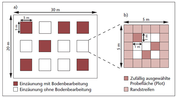 a) eingezäunte Fläche mit den zwölf Untersuchungsflächen