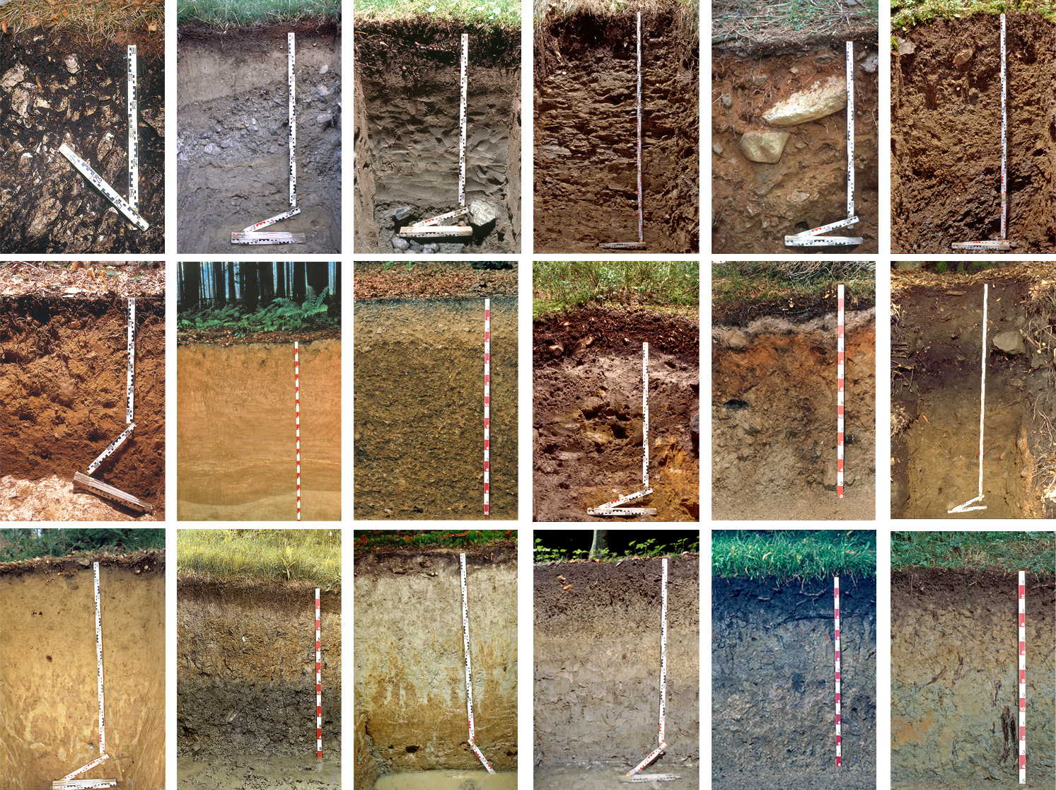 Böden entwickeln sich in langen Zeiträumen aus dem Ausgangsgestein durch das Einwirken von Klima, Relief und Lebewesen (Bakterien, Pilze, Bodentiere, Pflanzen). In der Schweiz sind die meisten Böden rund 10’000 Jahre alt, denn ihre Entwicklung begann mit der Freilegung des Ausgangsgesteins nach dem Rückzug der Gletscher am Ende der letzten Eiszeit. Dank heterogener Geologie und Klima ist hier auf diese Weise eine grosse Vielfalt an unterschiedlichen Waldböden entstanden (Abb. 1). Waldböden gelten als naturnah, da die Nutzung der Wälder ohne die üblichen landwirtschaftlichen Kulturmassnahmen wie Bearbeitung, Düngung oder Bewässerung auskommt.