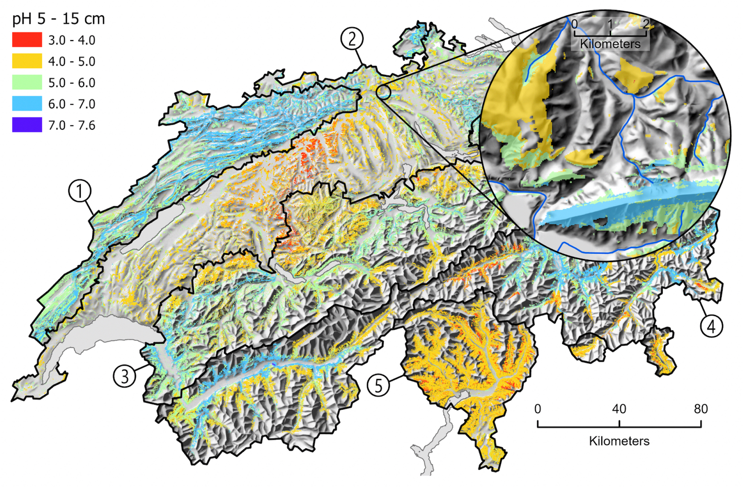 Mit Hilfe von maschinellen Lern- Algorithmen sind wir seit Kurzem in der Lage, räumlich hochaufgelöste digitale Karten von Bodeneigenschaften für den ganzen Schweizer Wald zu erstellen, zum Beispiel eine Vorhersage des pH-Wertes in 5 bis 15 cm Bodentiefe (Abb. 5). Um aber Bodeninformationen als Planungshilfe für Vollzugsbehörden und forstliche Entscheidungsträger nutzbar zu machen, muss ein finaler Schritt von der Kartierung einzelner Bodeneigenschaften zur Bewertung und Kartierung von Bodenfunktionen gemacht werden. Beispiele sind Karten des Wasserretentions- oder des Säurepuffervermögens, wie sie das Bayerische Landesamt für Umwelt herausgibt.