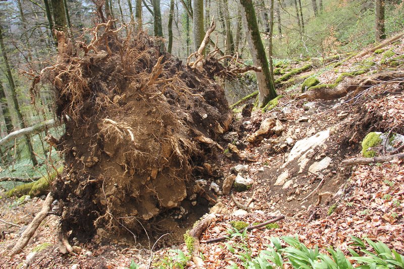 Abb. 3: An der Lägern hat ein Sturm Bäume entwurzelt. Dies führt lokal zu einer zerstörten Bodenstruktur. Foto: Peter Waldner (WSL)