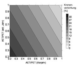 Den additiven Einfluss der Quotienten AET/PET des aktuellen Jahres und der des Vorjahres auf den Kronenzustand demonstriert die Darstellung in Abb.1. Hier wird von einem Bestandesalter von 80 Jahren ausgegangen und keinerlei Pilz- oder Insektenbefall unterstellt (Befallsstufe jeweils = 0). Die abgebildeten Modellwerte der prozentualen Kronentransparenz beziehen sich auf die Ansprache zum Zeitpunkt Anfang August. Aus der Darstellung wird deutlich, dass sich vor allem wiederholt auftretende Trockenjahre (kleine Werte des Quotienten AET/PET) negativ auf den Kronenzustand auswirken.