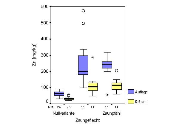In Abb.1 sind die Zinkgehalte in Auflage und mineralischem Oberboden auf der Untersuchungsfläche - stratifiziert nach der Lage der Entnahmestelle (Nullvariante, Zaunpfahl und Zaungeflecht) - dargestellt. Die Mediane der Nullvariante liegen bei 63 mg/kg (Auflage) bzw. 33 mg/kg (Mineralboden). Demgegenüber sind deutlich erhöhte Werte bei der Zaunvariante zu verzeichnen. Über alle am Zaun entnommenen Proben liegen die Mediane bei 235 mg/kg in der Humusauflage und bei 109 mg/kg in 0-5 cm Tiefe. Es lassen sich keine Unterschiede zwischen der Probennahme unmittelbar am Zaunpfahl und derjenigen mittig zwischen den Pfählen (Variante „Zaungeflecht“) erkennen.