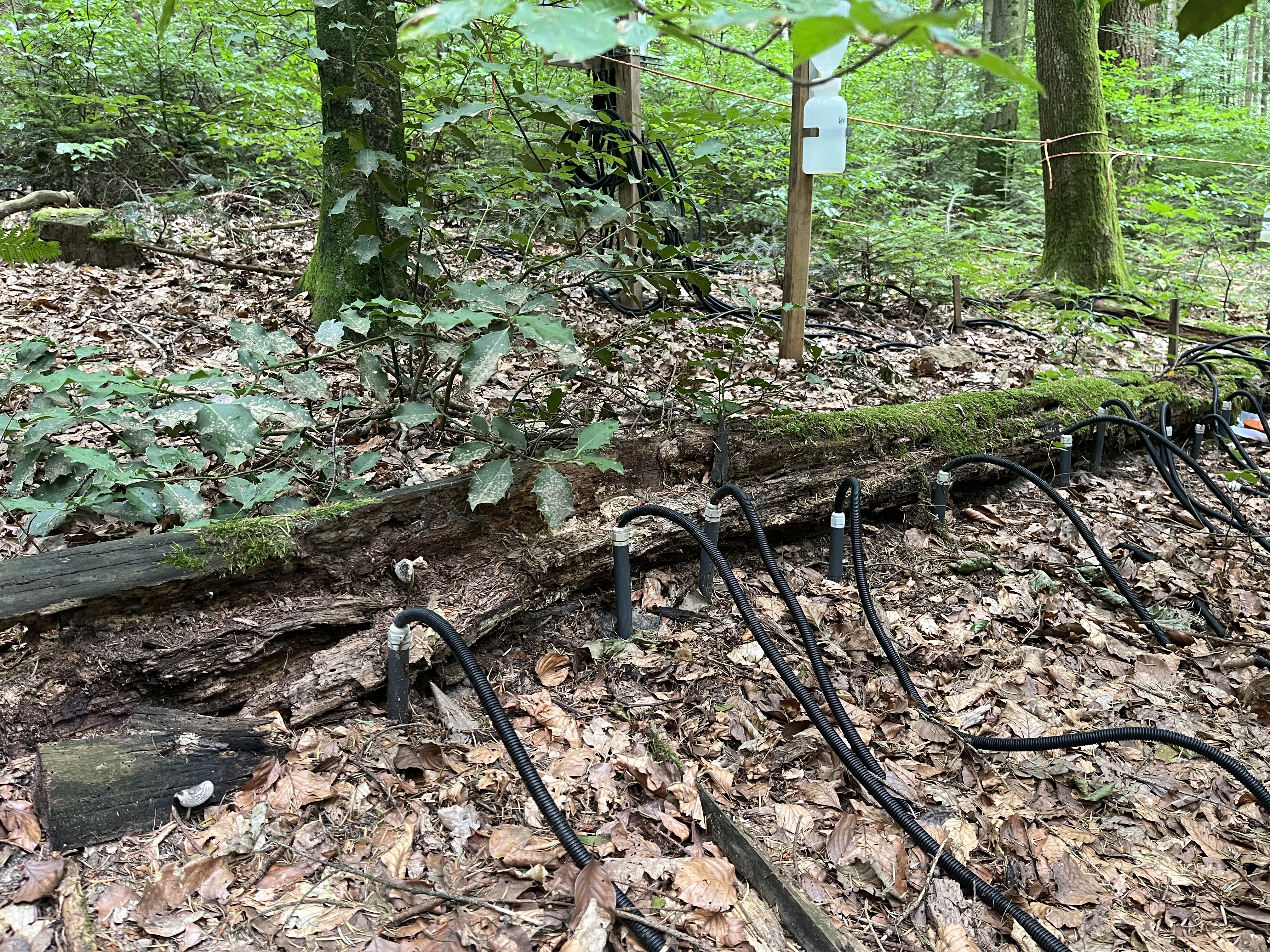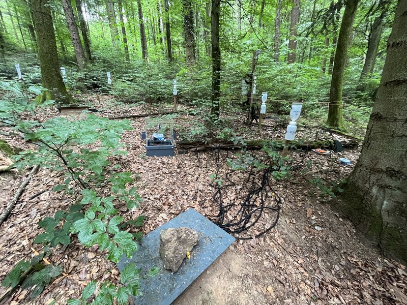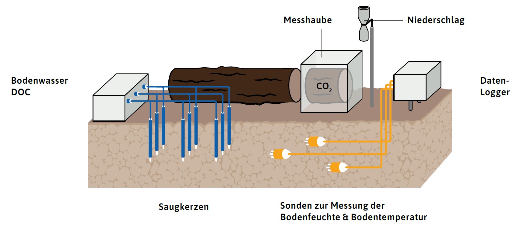 Die FVA erfasst seit etwas mehr als zwei Jahren die Kohlenstoffflüsse unter liegenden Totholzstämmen sowie auf benachbarten, nicht von Totholz beeinflussten Kontrollflächen. Die Untersuchungsflächen wurden so ausgewählt, dass unterschiedliche Standorte und Baumarten abgedeckt sind. Neben den Baumarten Buche und Fichte werden Totholzstämme auf Flächen mit verschiedenem Ausgangssubstrat (karbonatisch/silikatisch) und daraus folgend unterschiedlichem Versauerungszustand (pH-Wert) untersucht. Um den Effekt des Bodenwasserhaushalts zu erfassen, werden Stämme auf einem süd- und einem nordexponierten Hang untersucht. Aufgrund der unterschiedlichen klimatischen Verhältnisse auf den Hängen sind im Boden auf dem südexponierten Hang trockenere und wärmere Bedingungen vorzufinden – im Gegensatz zum nordexponierten Hang.