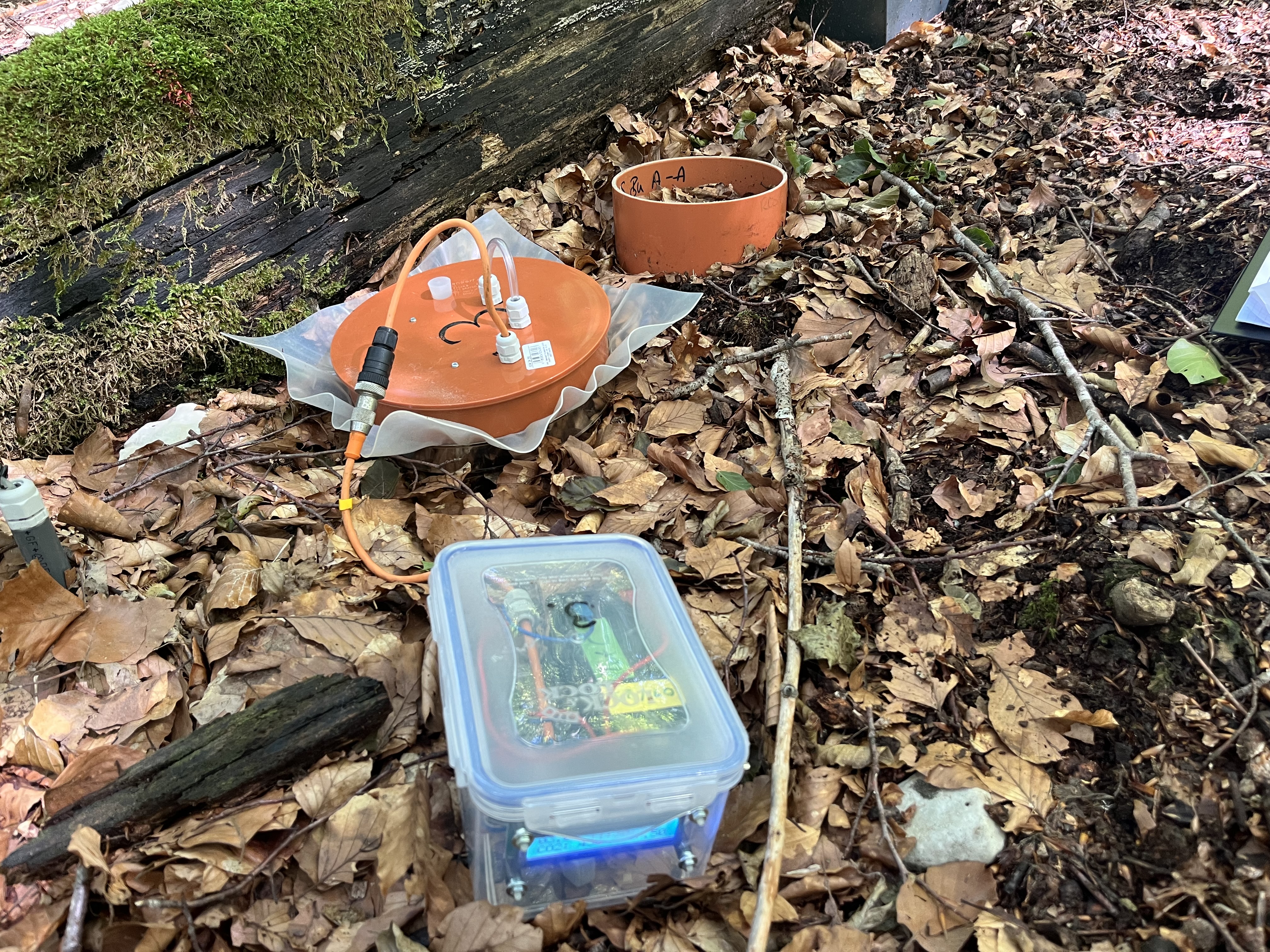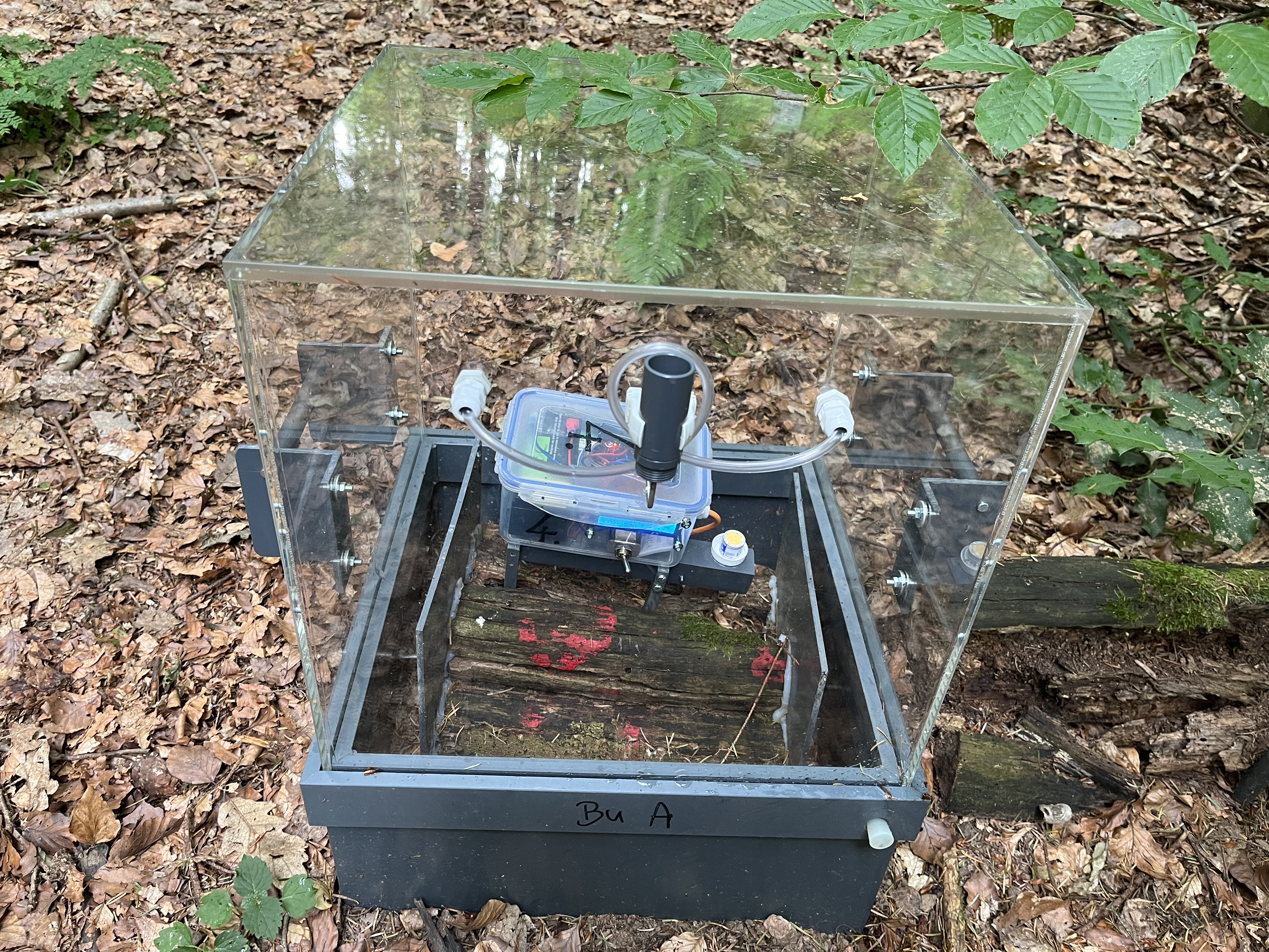 Die CO2-Austräge aus dem Totholz werden durch sogenannte Kammermessungen bestimmt. Dabei wird die CO2-Konzentration in einer geschlossenen Kammer über einen gewissen Zeitraum gemessen. Über den Anstieg der Konzentration und unter Berücksichtigung von Temperatur und Luftdruck werden die CO2-Austräge berechnet.