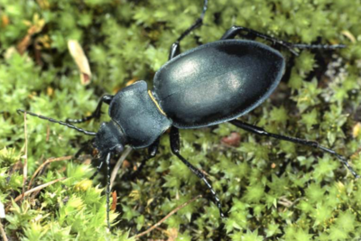 Abb. 2 - Glatter Laufläfer (Carabus glabratus) - dieser nachtaktive Käfer versteckt sich tagsüber unter Moospolstern oder unter liegendem Totholz. Indbesondere in der Zerfallasphase eines Waldbestandes ist diese Art anzutreffen.