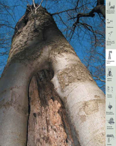 Abb. 3 - Bäume, deren Splint durch Blitzeinwirkung freigelegt ist, werden als Initialstadium von Grosshählenbildungen erhalten. Die umfassende freiklegung führt zwangsläufig zur Ansiedlung holzabbauender Pilze. Auch diverse Insekten oder die Bruthöhlen von Buntspechten sind dort anzutreffen.