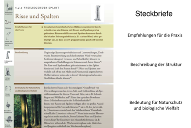 Die Steckbriefe zeigen neben Skizzen und Beschreibungen der Strukturen auch deren Bedeutung für den Naturschutz. Zusätzlich werden charakteristische Arten vorgestellt, die diese Strukturen nutzen.