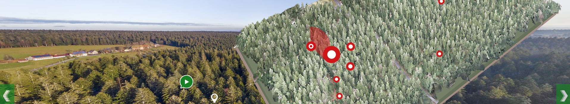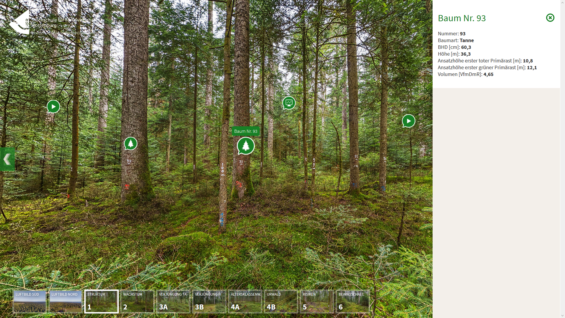 Es ist möglich, sich umzuschauen und einen quasi-realistischen Eindruck der insgesamt acht Waldbilder zu erhalten. Dabei werden zu ausgewählten Bäumen spezielle Informationen abgebildet, z. B. die Baumart, dendrometrische Kenngrößen wie Ansatzhöhe des grün- bzw. totastfreien Schaftes oder auch das Derbholzvolumen. Diese Zusatzinformationen werden jedoch erst bei gezieltem Anklicken eines Fragezeichens auf dem betreffenden Baum sichtbar, sodass der Charakter eines Quizz sichtbar wird und als Angebot zum selbstgesteuerten Lernen genutzt werden kann. Informationen zum Wachstum von Einzelbäumen oder fotografische Details werden in Thementafeln auf den betreffenden Seiten eingeblendet.
