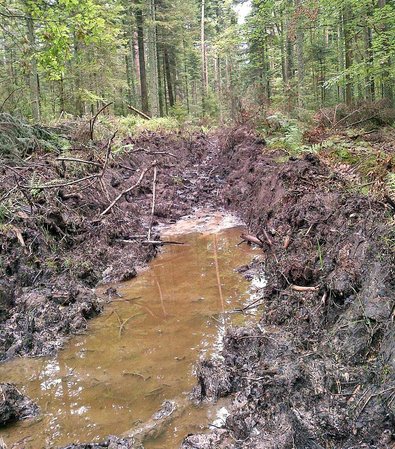 Zusammenfassend ist festzustellen, dass der Elliator die Anforderungen an das Bodenschutzkonzept von ForstBW vollkommen erfüllt. Auch bei mehr als zehn Überfahrten betrug die Fahrspurtiefe auf nassesten Standorten maximal 15-20 cm. Damit übertrifft die Spezialrückemaschine eine gleichzeitig in den Revieren eingesetzte 6-Rad-Maschine mit aufgezogenen Moorbändern, die Fahrspurtiefen von deutlich mehr als 40 cm verursachte, um Längen (Abb. 4+5). Für eine Optimierung der Arbeiten ist eine Begradigung von Rückegassen durch die Entnahme einzelner Bäume empfehlenswert. Der geringere Kurvenradius führt zu einer Erhöhung der Geschwindigkeit und damit zu einer höheren Leistung der Maschine.