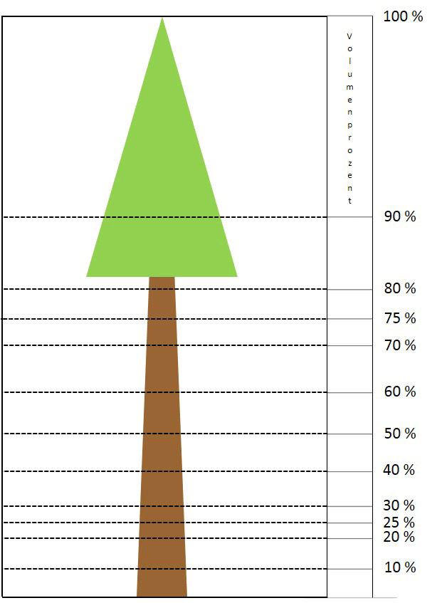 Um am stehenden Baum eine Wertansprache durchzuführen, benötigt man häufig Informationen über die Anteile einzelner Stammabschnitte am Baumvolumen. Hier kann der Göttinger-Förster-Stick hilfreich sein. Der Betrachter entfernt sich soweit vom Baum, bis dieser ganz in den senkrecht gehaltenen Göttinger-Förster-Stick passt. Die jeweiligen Volumenprozente können anschließend abgelesen werden (Abb. 1). Zugrundegelegt ist hier der Schaftaufbau nach den Ausbauchungsreihen mit der echten Formzahl 0,5 für Fichte nach Prodan (1965, S. 122), die vereinfachend auch für andere Baumarten angewendet werden kann.