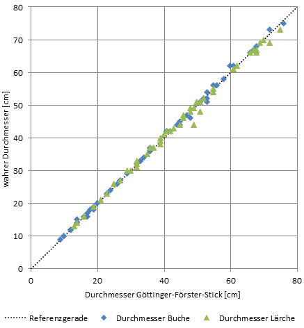 Auf diese Weise können Durchmesser bis 84 cm ermittelt werden. Das Verfahren der Durchmesserschätzung mittels Göttinger-Förster-Stick erfolgt nach kurzer Einübung recht genau, wie die Ergebnisse der Bachelorarbeit von Bloss (2014) zeigten. Im Zuge der Arbeit wurden unter anderem 50 Lärchen und 50 Rotbuche im Wald aufgenommen und zur Kontrolle gekluppt. 91 der 100 Messungen wiesen dabei Abweichungen von unter einem Zentimeter auf. In Abb. 3 sind jeweils die mit dem Försterstick und der Kluppe ermittelten Durchmesser dargestellt.