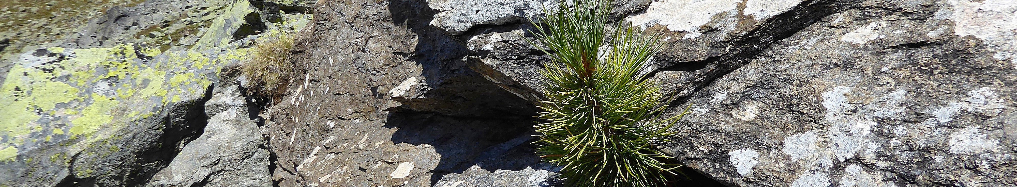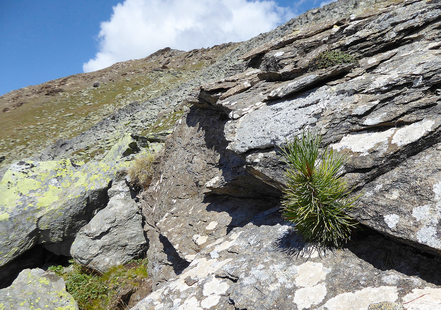 Doch die Analyse von Luftbildern hat ihn ins Nachbartal nach Zermatt geführt. Und nach einer mehrtägigen Suche fand er im Sommer 2015 am Nordhang des Gornergrates einige kleine Arven auf 2745 m in einer unzugänglichen Felswand. Das grösste Exemplar ist zirka 2,2 m hoch und hat in 1,3 m Stammhöhe einen Durchmesser von ungefähr 6 cm. Schliesslich entdeckte Brändli auf 2765 m einen erst 11 cm hohen Winzling, in einer Felsspalte am nahe gelegenen Unterrothorn (Abb. 1).