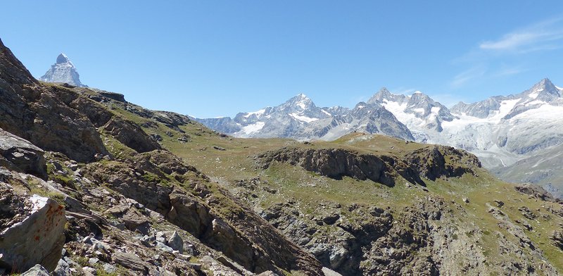 Abb. 3 - In inneralpinen Gebieten mit kontinentalem Klima wachsen Bäume in der Regel bis in höhere Lagen als an den Voralpen. Deshalb sind in der Schweiz das Wallis und das Engadin prädestiniert für die Suche nach Rekordbäumen. Im Bild Matterhorn, Dent Blanche, Ober Gabelhorn und Zinalrothorn (v.l.n.r.). Foto: Urs-Beat Brändli (WSL)