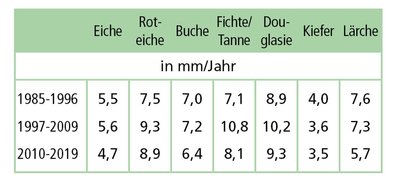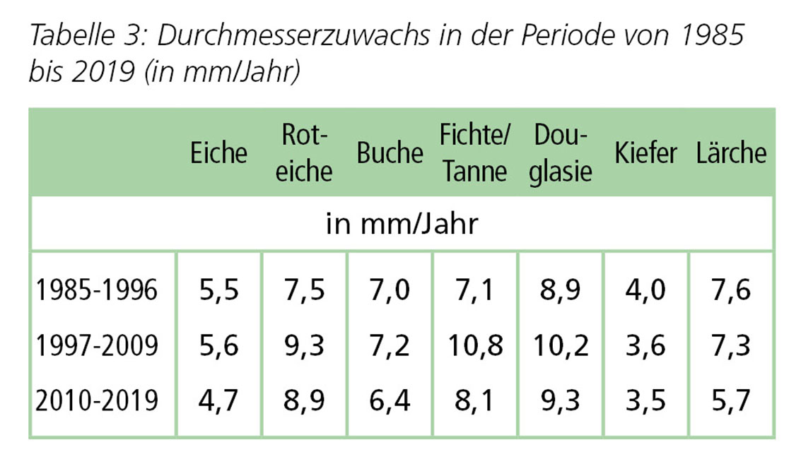 Durch die seit 1985 erfolgten Stichprobeninventuren kann an den verbliebenen Bäumen das Wachstum seit über 33 Jahren nachvollzogen werden. Insgesamt konnte diese Zeitreihe an 4.000 Bäumen in der Hauptschicht bzw. im Überhalt erstellt werden. Roteiche, Tanne und Douglasie zeigen erwartungsgemäß mehr oder weniger über alle Alter hohe Durchmesserzuwächse zwischen 7 und 11 mm pro Jahr. Bei Eiche konnten durchschnittliche Zuwächse von 4 bis 5 mm pro Jahr ermittelt werden. Bei Kiefer fällt der Zuwachs mit durchschnittlichen Werten von 3 bis 4 mm im Jahr mit hohen Werten in der Jugend, aber auch sehr geringen Zuwächsen im Alter deutlich ab. Erstaunlich ist der hohe Durchmesserzuwachs bei der Buche von 6 bis 9 mm im Jahr, der bis in die höchsten Altersklassen anhält. Der flächenbezogene ertragsgeschichtliche Zuwachs hat sich zwischen 1985 und 2018 um 20 % deutlich erhöht, mit einem Höchstwert von 13,4 Vfm/ha und Jahr in der Periode 1996 bis 2008.