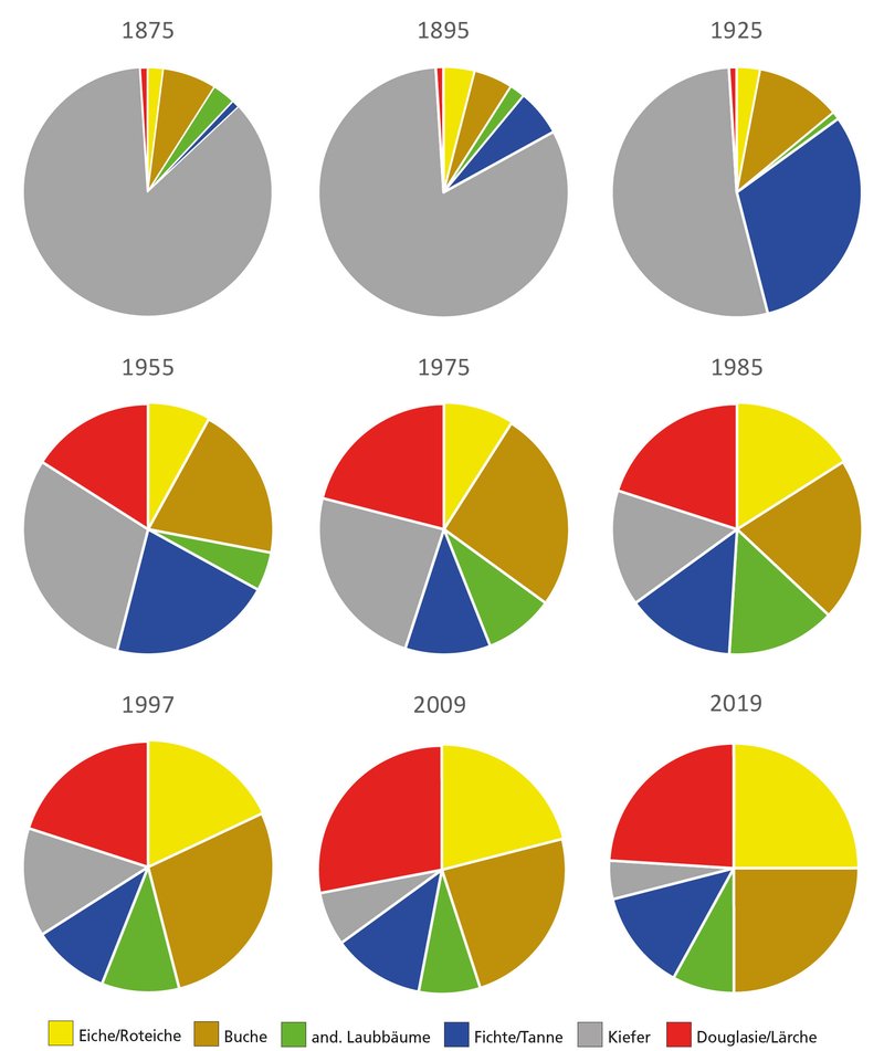 Abb. 3: Entwicklung der Baumartenanteile von 1885 bis 2019. Quelle: Band 63, Aus dem Walde