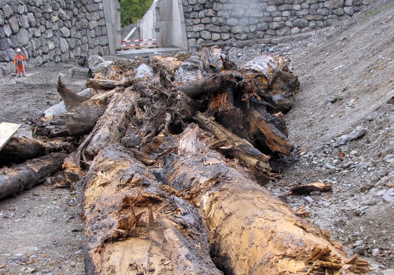 - Weitere 50 Bäume wurden in der Nähe von Engi (Kanton Glarus) mit Unterstützung der lokalen Baufirma bei der Errichtung eines Hochwasserschutzwalles geborgen (Abb. 3). Dieses Holz wurde vermutlich durch einen Murgang ca. 5-7 m tief verschüttet und blieb seitdem im Lehm konserviert.