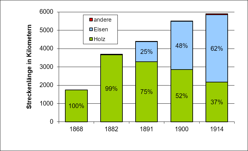 Abb. 5 - Schwellenarten des Schweizer Schienennetzes 1868-1914. Quelle: Eisenbahnstatistik 1868-1914