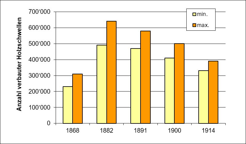 Die Anzahl effektiv verbauter Holzschwellen ist in Abbildung 6 dargestellt. Vorsichtig geschätzt dürften zum Zeitpunkt der grössten Ausdehnung des mit Holz unterlegten Schienennetzes (1882) 490'000 bis 640'000 m3 Schwellenholz benötigt worden sein. Dies entsprach zwischen 18 und 27 % eines nachhaltigen Gesamtjahresertrags der Schweiz um 1860. Der Aufbau des Streckennetzes bis zur grössten Verbreitung der Holzschwellen vollzog sich allerdings über 35 Jahre. Der Bedarf an Schwellenholz schlug sich deshalb relativ behutsam nieder und dürfte im jährlichen Mittel nur selten über einem Prozent des Gesamtjahresertrags gelegen haben. Hinzu kamen für die Erneuerung jährlich 10'000 bis 80'000 m3 Schwellenholz. Die Fortschritte in der Imprägnierungstechnik und das Ersetzen Hunderter von Schienenkilometern mit Eisenschwellen liessen den Bedarf für die Erneuerung nach 1882 ebenfalls stark zurückgehen.