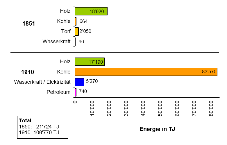 Abb. 7 - Primärenergiebilanz der Schweiz 1851 und 1910. Quelle: Marek: Kohle, S. 36