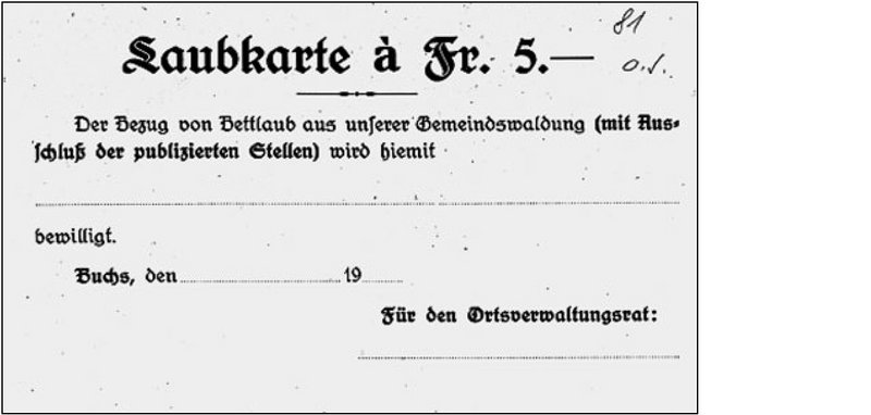 Gemäss der Wirtschaftspläne war in Montlingen Laubsammeln bis 1925 untersagt und in Oberriet bis 1948. In Werdenberg war das Laubsammeln nur für die Ortsbürger gratis; andere mussten eine Taxe bezahlen. Die war zum Beispiel in Sevelen, Grabs, Frümsen, Lienz, Buchs und Wartau der Fall. In Sennwald mussten gar alle einen Ausweis besitzen, um lauben zu dürfen. In Buchs war geplant, den Laubbezug ab 1938 allgemein nur noch bewilligt stattfinden zu lassen (Abb. 5).