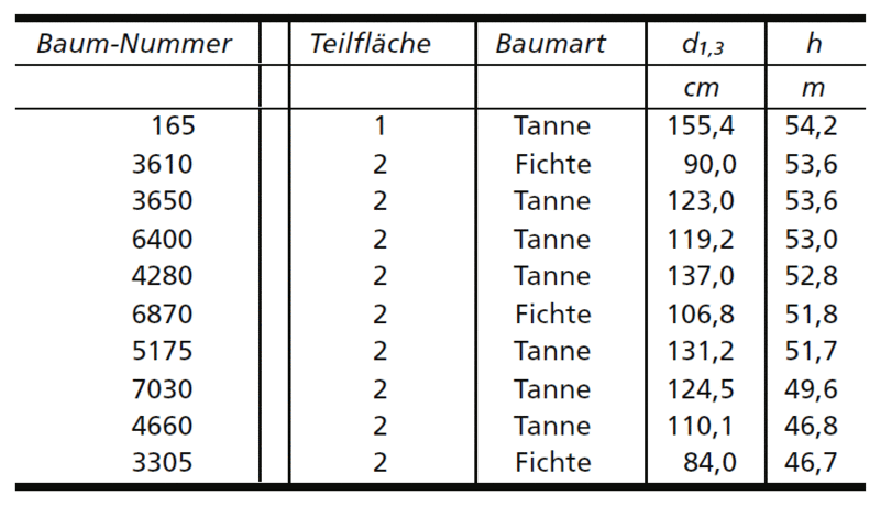 Eine genaue Vermessung der Tanne 165 und der Fichte 3610 ergab Baumhöhen von 55,1 bzw. 55,4 m (die Unterschiede liegen in der Messtechnik oder in einem leichten Schiefstand der Bäume). Allerdings hat die Tanne 165 beim Sturm Lothar im Dezember 1999 ein Gipfelstück von rund zehn Metern verloren. Die Gründe, weshalb acht der zehn dicksten Bäume von 1932 verschwunden sind, sind in Tabelle 3 zusammengestellt. Auffallend ist mit fast 40% der hohe Anteil an Blitzschlägen. Nur zwei der acht Tannen können als ordentliche Anzeichnung bezeichnet werden.