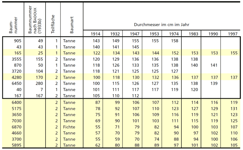 Gemäss Bundesratsbeschluss vom 19. März 1912 "sind 10 der stärksten und schönsten Bäume zu bezeichnen, welche möglichst lange überzuhalten sind. Bei späteren Nutzungen einzelner Stämme sind dieselben durch wüchsige Stämme immer wieder auf die Zahl von 10 zu ersetzen." BADOUX (1933b) listete die bei der Aufnahme von 1932 ermittelten zehn stärksten Stämme auf. Sie hatten damals einen Umfang in Brusthöhe von 469 cm bis 348 cm, was Durchmessern von 149 cm bis 111 cm entspricht. Diese Bäume wiesen in den acht Jahren von 1924 bis 1932 einen Umfangzuwachs von 0 bis 23 cm auf, was einer maximalen Jahrringbreite von 4,6 mm entspricht. Von diesen zehn Bäumen stehen heute noch zwei: die Tanne 165 (bei Badoux 25) in Teilfläche 1, die 1932 an dritter Stelle stand, und eine Tanne aus Teilfläche 2. Die Tabelle 1 beschreibt die zehn stärksten Bäume im Jahr 1997.