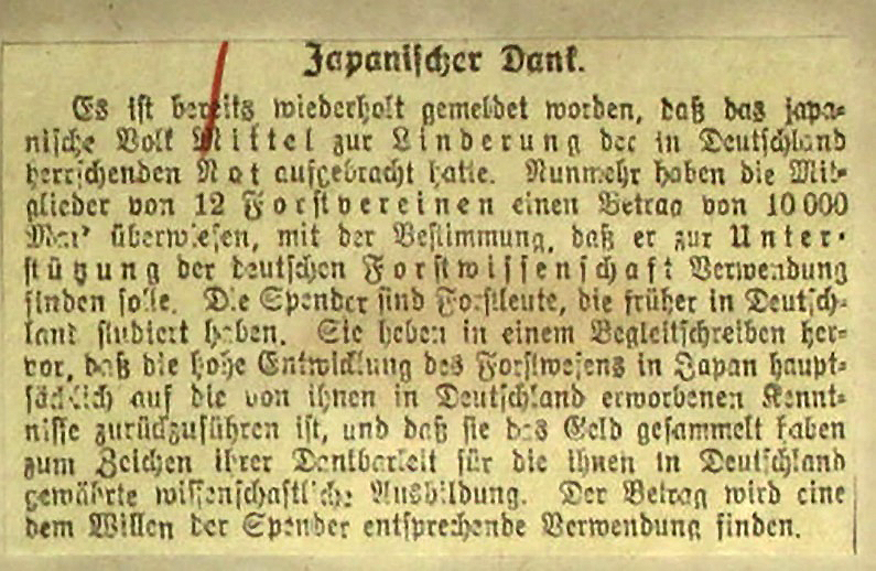 Kaum eineinhalb Jahre nach der Freilassung der letzten Kriegsgefangenen im Juli 1921, standen sich die beiden Länder nun wieder freundschaftlich gegenüber, die Spende über 100.000 Mark ist dabei ein wichtiger Beleg. Dass in Deutschland nur wenig Kenntnis über die engen forstlichen Verbindungen bestand, lässt sich aus den ministeriellen Schriftwechseln entnehmen, die nach Eingang der 100.000 Mark, abzüglich 27,50 Mark Bankspesen, erfolgte. So hatten die Japaner zwar ausdrücklich darauf hingewiesen, dass die Verteilung nach „Gutdünken“ erfolgen möge und auch aus dem Schreiben des Reichsministeriums des Inneren vom 18.10.192 geht hervor,