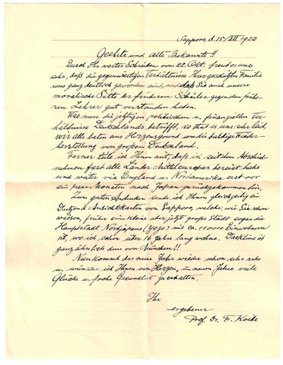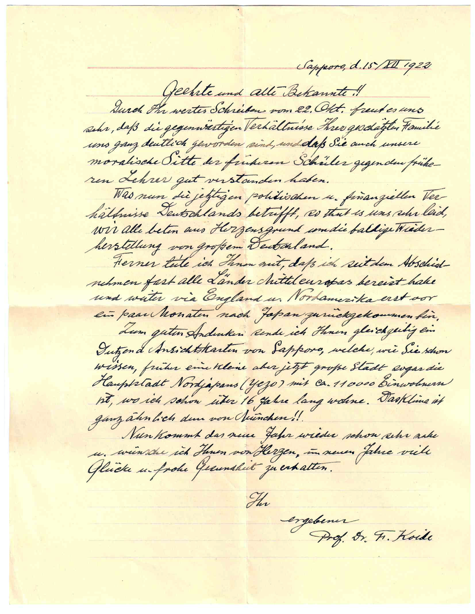 „Geehrte und alte Bekannte!! Durch Ihr wertes Schreiben vom 22. Okt. freut es uns sehr, daß die gegenwärtigen Verhältnisse Ihrer geschätzten Familie uns ganz deutlich geworden sind, und daß Sie auch unsere moralische Sitte der früheren Schüler gegen den früheren Lehrer gut verstanden haben“ (Abb. 6, Koide, 1922).