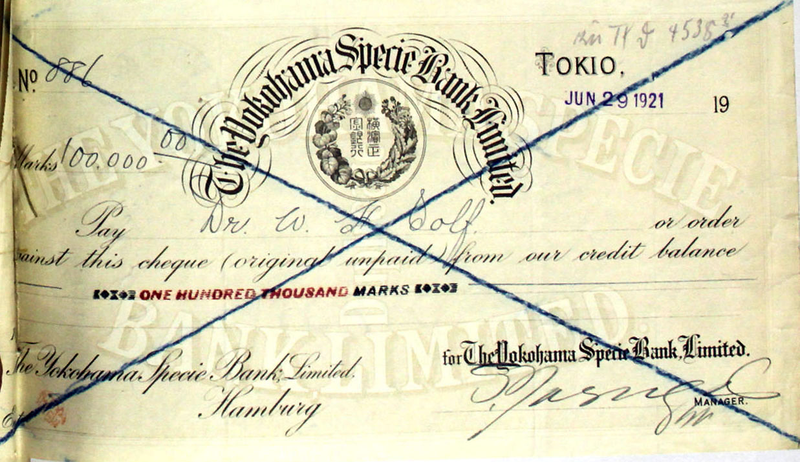 Am 05. Juli 1921 überreichten in der deutschen Botschaft in Tokio der Professor für Forstwissenschaft und Vorsitzender des japanischen Forstvereins, sanrinkai, Prof. Dr. Zentaro Kawase (kaiserl. Universität Tokio) und der Oberförster Baba (Ministerium für Landwirtschaft und Handel) dem Vertreter des Deutschen Reichs Herrn Botschafter Wilhelm Solf einen Barschreck über 100.000 Mark* (Abb. 1). Laut Aus dem dazu überreichten Begleitschreiben geht hervor, dass es sich um eine Sammlung von Vereinen, Personen und Unternehmen handelt, die sich der deutschen Forstwissenschaft verbunden fühlten und denen von sich in Deutschland befindlichen japanischen Forststudenten mitgeteilt worden war, dass: