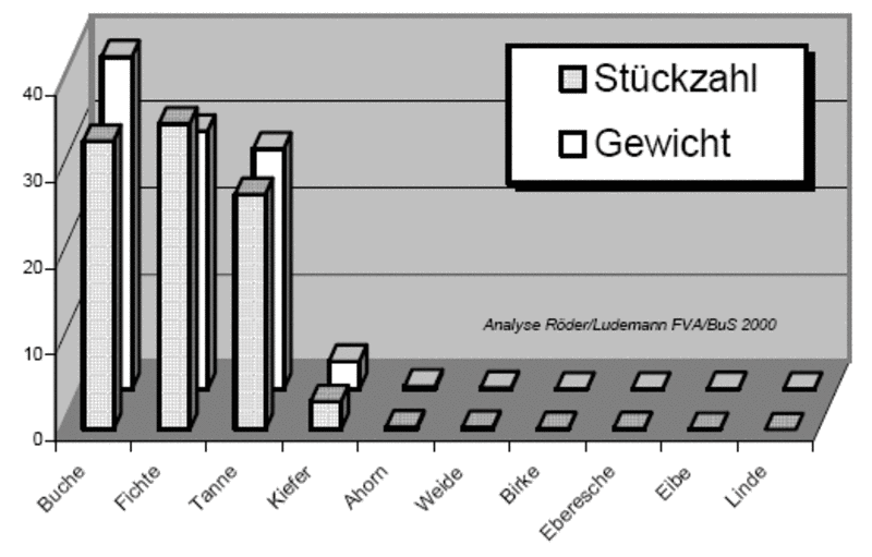 Mit einer Ausnahme stammt das buchenreiche Fundgut von den Plätzen des Dachsbaus, also aus dem Westteil des Untersuchungsgebietes. Der einzige buchendominierte Platz des östlichen Gebietes befindet sich in einer besonderen standörtlichen Situation, im Talgrund des dort in die danubische Hochfläche eingeschnittenen Steinatals, also am Fuß steilerer Hänge. In den Holzkohleproben der historischen Meilerplätze ließ sich somit für das westliche Gebiet bei Todtmoos weit überwiegend Buche und Tanne sowie wenig Ahorn und Fichte nachweisen, wobei die Buche ausnahmslos vorherrscht, bei einem sehr verschiedenen Tannenanteil von 4 bis 46%.