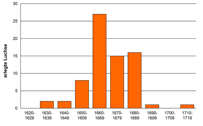 Abb. 2: Zwischen 1630 und 1720 wurden im kurmainzischen Spessart 72 Luchse erlegt. Ab ca. 1670 begann der letzte Vernichtungsfeldzug gegen den Luchs.