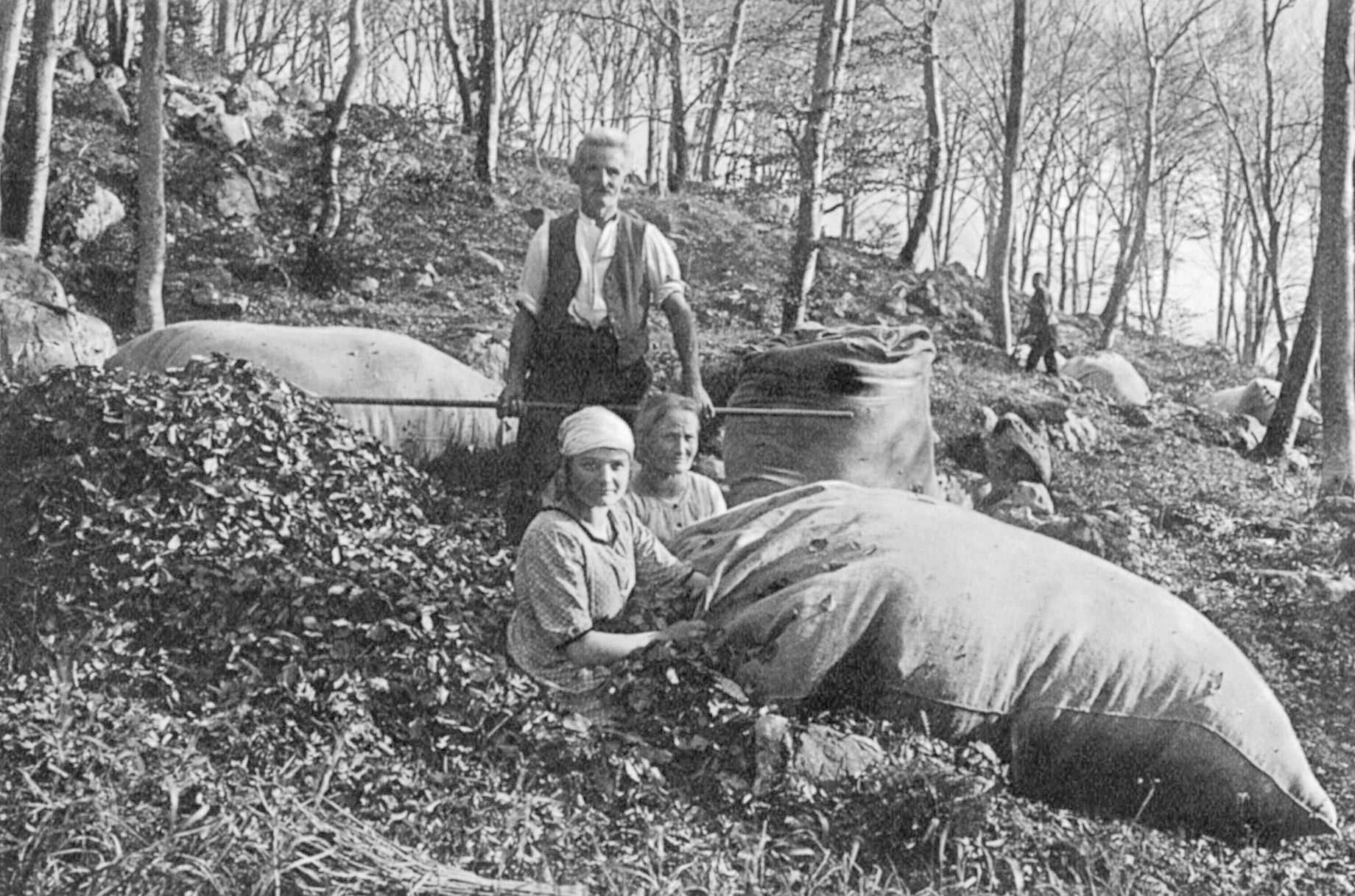 Neben der Verwendung im Stall trug Nadel- und Laubstreue auf Heuwiesen und Kartoffeläckern zur Dungbildung bei. - Bettlaub