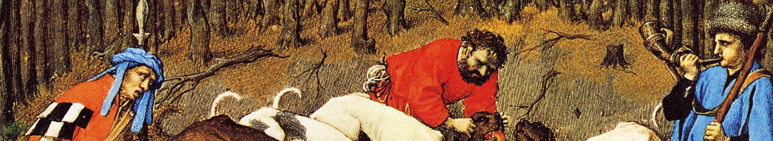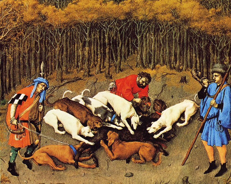 Im berühmten Stundenbuch des Herzogs von Berry ist eine solche Jagdszene mit Hunden, die ein Schwein hetzen und stellen, abgebildet (Abb. 2). Früh wurden die Adelssprösslinge in die Jagd eingeführt. Der dreizehnjährige Herzog Ulrich von Württemberg erlegte 1507 seine erste Wildsau, was Auftakt zu einer lebenslangen Jagdleidenschaft war. Diese erste herzogliche Sau wurde in Holz nachgebildet, mit dem Fell der Beute überzogen und mit einem Bewegungsmechanismus versehen. Sie kann noch heute im Schloss Urach besichtigt werden.