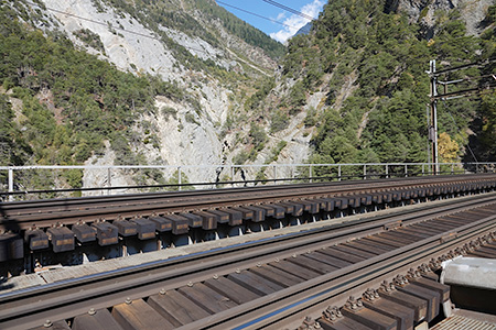 Hinter dem Campingplatz von Sur En steht die Talstation der Valtellina-Seilbahn. Sie liegt auf 1124 m ü. M. zwischen hoch aufragenden Fichten und Föhren. Sanft, beinahe liebevoll, wie auf die Schulter eines guten Freundes, tätschelt Mario Riatsch, Revierförster der Administraziun forestala Sent, auf das rostige Laufrad der Seilbahn und sagt: "Diese Bahn war ein geniales Transportmittel. Ausser dem Rauch der Bremsklötze und dem Zigarrenrauch des Maschinisten konnte sie völlig CO2-neutral betrieben werden. Zudem ist sie robust, resistent gegen Regen und Schnee und auch heute noch funktioniert sie tadellos."