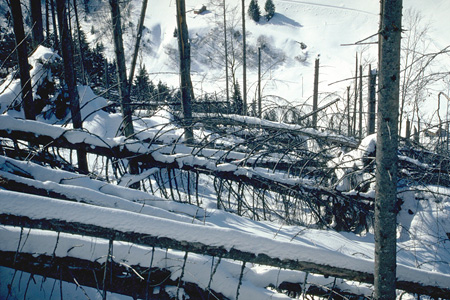 Mit zunehmendem Anteil der Nadelhölzer an der Gesamtbestockung der Wälder erhöhte sich auch die Gesamtmenge der Bruchschäden an Derbholz. In den 1870er Jahren, in denen mindestens zwei größere Schneebruchkalamitäten auftraten (1870 und 1875), häuften sich die Klagen über stärkere Schneebruchschäden. Im November 1870 fielen in den höher gelegenen Revieren des Regierungsbezirks Aachen 51.726 „Raum-Kubikmeter“ (FoDoS, Nachlass A. Hiersekorn) an.