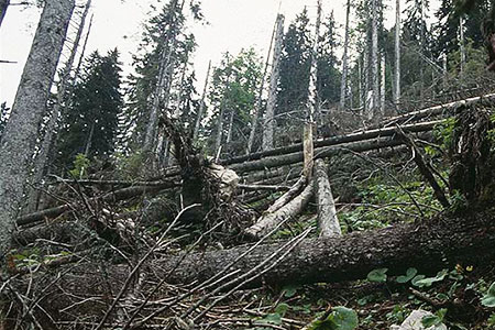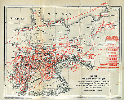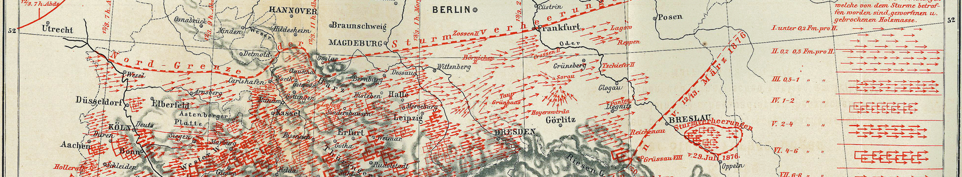 Ein in den Quellen gut dokumentiertes Beispiel für einen schweren Orkan mit immensen Schäden in den Wäldern ist der Märzorkan 1876 (12./13.3.1876). Er gilt als einer der schlimmsten seiner Art und wurde als ein mehr als 100-jähriges Ereignis eingestuft. Ihm fielen nach niedriger Schätzung 7-8 Mio. Festmeter Derbholz zum Opfer. Dass es nicht wesentlich mehr waren, hängt sicherlich mit der damals noch nicht so weit fortgeschrittenen Bestockung mit Nadelhölzern zusammen: „An der Egge (Oberf. Altenbeken) wurden die Fichtenhorste aus dem Laubholz herausgebrochen (...). In Hardehausen (...) sind nur Fichten gebrochen, obwohl das Revier 84 % Laubholz-Bestände hat; auch in den übrigen Revieren der Regierungs-Bezirke Minden und Arnsberg, welche sämmtlich überwiegend Laubholzbestände haben, ist der Schaden in Laubholz nicht erheblich, der in Fichten weitaus vorherrschend. Dasselbe gilt im Ganzen für die Reviere am Nordabhang der Eifel“ (Bernhardt 1878, 219).
