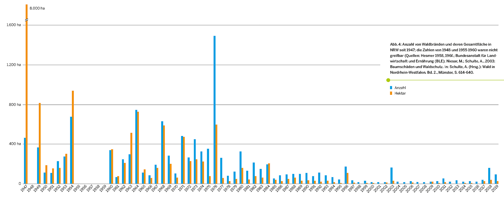 Abb. 4: Anzahl von Waldbränden und deren Gesamtfläche in NRW seit 1947; die Zahlen von 1948 und 1955-1960 waren nicht greifbar (Quellen: Hesmer 1958, 196f.; Bundesanstalt für Landwirtschaft und Ernährung (BLE); Niesar, M.; Schulte, A., 2003: Baumschäden und Waldschutz. In: Schulte, A. (Hrsg.): Wald in Nordrhein-Westfalen. Bd. 2., Münster, S. 614-640.