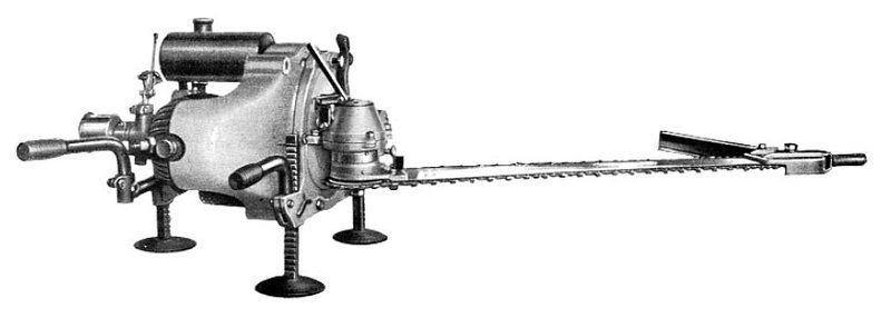 Auch die Erfindung des Engländers A. Ransome um 1860 (Abb. 2) beruhte auf dem Fuchsschwanzprinzip. Er wandte aber bereits einen mechanischen Antrieb an: Dampf, erzeugt von einem Dampfkessel mitten im Wald. Verfeuert wurde das reichlich vorhandene Holz. Flexible Druckleitungen versorgten sogar mehrere Geräte. Ein beweglicher und schwenkbarer Fuchsschwanz, fest verbunden mit einem Kolben in einem Zylinder, konnte Bäume fällen und einschneiden. Fast 20 Jahre dauerte die Entwicklung bis zur Einsatzreife, aber danach wurde das Gerät auch tatsächlich während 20 Jahren produziert und verkauft.