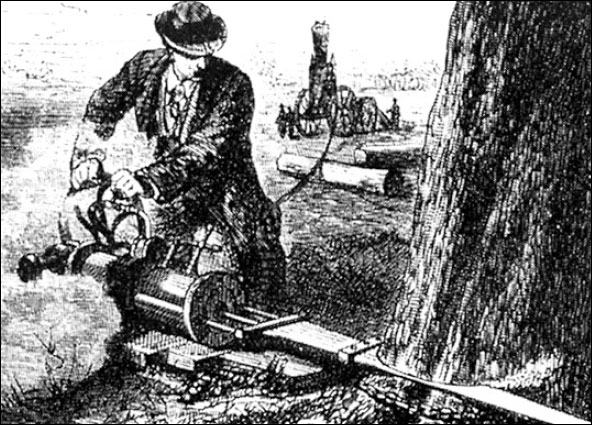 Ein anderes Gerät, das Hamilton 1861 erfunden hatte, wurde wirklich gebaut und sogar nach Europa in den Schwarzwald exportiert (Abb. 1): Zwei Männer bewegten über eine mit Schwungrädern versehene Welle und ein Zahnradgetriebe eine Sägevorrichtung in Form eines Fuchsschwanzes. Durch Schwenken des Schneidgerätes konnten sie fällen und einschneiden. Das Gerät war schwer, der Transport umständlich und zwei Arbeitskräfte schafften nicht mehr als mit der Axt.