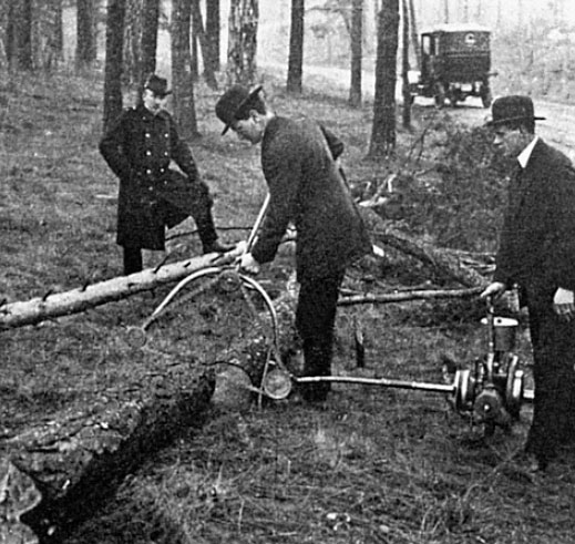 Ein ähnliches Durchbrennen eines Baumes ergab sich 1910 bei der Realisierung der Idee einer Berliner Firma: Ein Draht, verbunden mit einem Elektromotor, wurde pro Minute 1500 mal hin- und hergezogen; die entstehende Reibungshitze durchtrennte den Stamm.