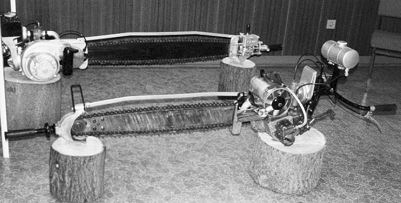 Abb. 7 - Im Vordergrund die Eigenbausäge von Alfred Kniesche. Deutlich erkennbar: Rollermotor mit Zwangsgebläse, darunterliegendes Getriebe mit Standmagnetzündung, rechts davon der Kickstarter.