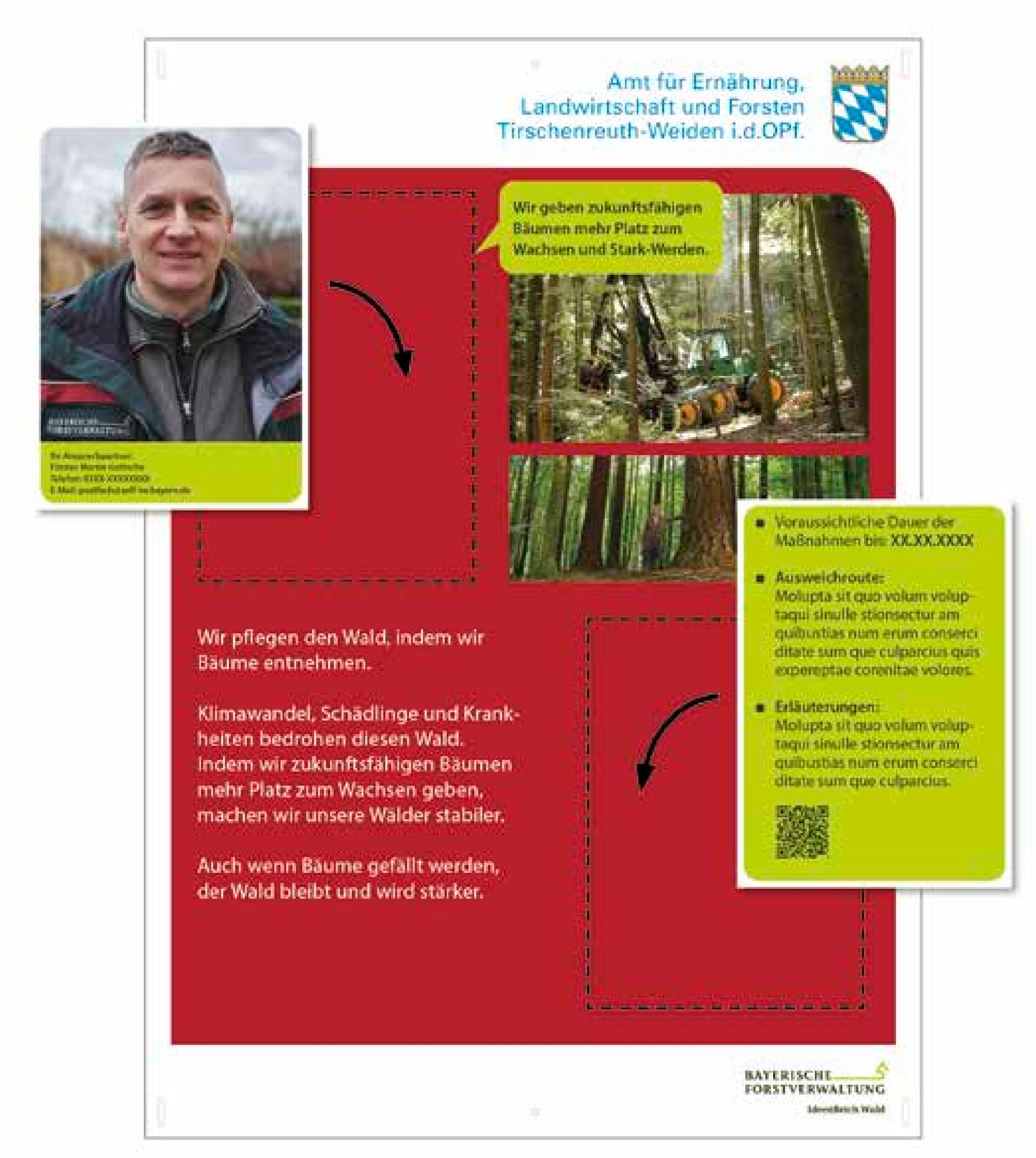 Eines der beiden (auswechselbaren) laminierten Infoblätter befindet sich links neben den oben genannten Abbildungen zur Maßnahme. Darauf ist eine Person dargestellt, zu der eine Sprechblase mit einer kurzen Kernbotschaft gehört. Auf diese Weise erhält die forstwirtschaftliche Maßnahme ein menschliches “Gesicht”. In unserem Beispiel ist die Person ein Revierförster der Bayerischen Forstverwaltung, der für die Betriebsausführung im Kommunalwald zuständig ist. Die Dienstkleidung zeigt, dass es sich um einen Fachmann handelt und kennzeichnet die Maßnahme als eine fachlich berechtigte Aktion. Darunter stehen Name und Funktion. Für die weiteren Kontaktdaten werden die direkten beruflichen Kontaktdaten der Ansprechperson eingetragen oder die Daten einer Zwischeninstanz, wie z. B. ein Funktionspostfach. So erreichen Einwände, Befürchtungen und Unmut schnell die “Baustellenverantwortlichen”. Idealerweise können diese rasch reagieren, bevor negative Darstellungen z. B. in Zeitungen oder als Posts im Internet veröffentlicht werden. So lassen sich Vorurteile und unbegründete Vorwürfe abfangen, bevor sie sich zu öffentlichen Protesten aufschaukeln.