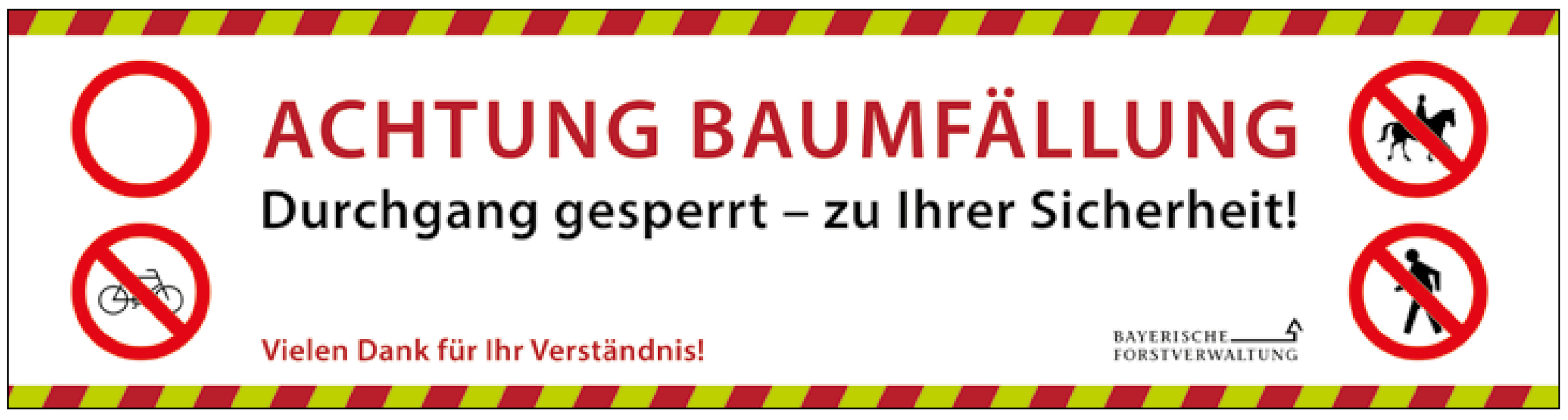 Der Bereich Forsten am Amt für Ernährung, Landwirtschaft und Forsten Tirschenreuth-Weiden i. d. OPf. (AELF TW) hat zur Entschärfung solcher Situationen ein Schilderset mit auswechselbaren Elementen sowie ein Absperrbanner entwickelt. Das Ziel: Die forstliche Maßnahme erläutern, Verständnis wecken und Verärgerung bei Waldbesuchern abbauen.