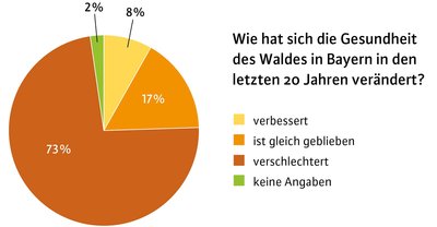 Die Gesundheit des Waldes ist für viele Menschen ein Grund zur Sorge. Drei Viertel der 3.504 Befragten (73 %) haben den Eindruck, dass sich die Gesundheit des Waldes in den letzten 20 Jahren deutlich verschlechtert hat. Für 17 % der Befragten haben sich keine Veränderungen in der Waldgesundheit ergeben; ein kleiner Teil war der Meinung, dass sich eine Verbesserung eingestellt hat (8 %) (Abbildung 2). Danach gefragt, wie sie die Gesundheit des Waldes heute einschätzen, gaben 39 % der Befragten an, dass der Zustand des Waldes schlecht sei, 44 % äußerten Bedenken. Demgegenüber schätzten 16 % der Befragten die Gesundheit des Waldes als (sehr) gut ein. Zwischen Einschätzung der Waldgesundheit und Häufigkeit der Waldbesuche gibt es keinen Zusammenhang. Ob wöchentlich oder seltener als einmal im Monat im Wald: Die Befragten schätzen die Waldgesundheit ähnlich (schlecht) ein. Insgesamt fühlen sich die Befragten eher zu wenig über den Waldzustand informiert. 53,3 % gaben an, dass sie zur Waldgesundheit in Bayern nicht gut informiert seien. Wenn es um die Waldgesundheit weltweit geht, liegt dieser Wert mit 64,1 % bei fast zwei Drittel der Befragten.