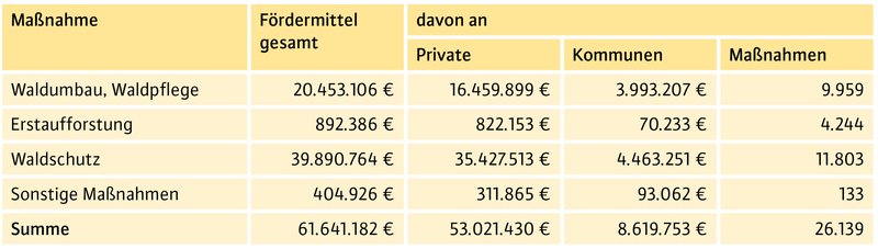 Waldbesitzende in Bayern werden beim klimagerechten Umbau ihrer Wälder vom Freistaat finanziell unterstützt. In bayerischen Wäldern sollen mehr Baumarten wachsen, neue Bäume in älteren Beständen nachkommen, abgestorbene Bäume zum Teil im Wald verbleiben. Privatwaldbesitzende und Kommunen bekommen Zuwendungen für Waldumbau und Waldpflege (einschließlich Naturverjüngung), Aufforstung, Bekämpfung von Schadinsekten sowie für sonstige Maßnahmen wie etwa Seilbahnbringung im Bergwald und Kalkung. 2020 wurden hierfür fast 62 Mio. € ausgezahlt, davon ging der Großteil an Privatwaldbesitzende. Abbildung 5 gibt einen Überblick über die Verteilung der Mittel und die Anzahl der geförderten Maßnahmen.