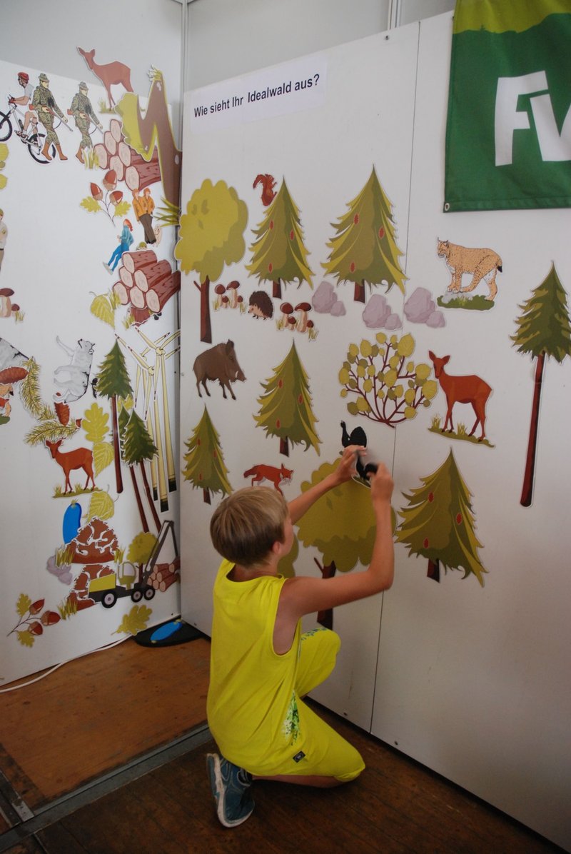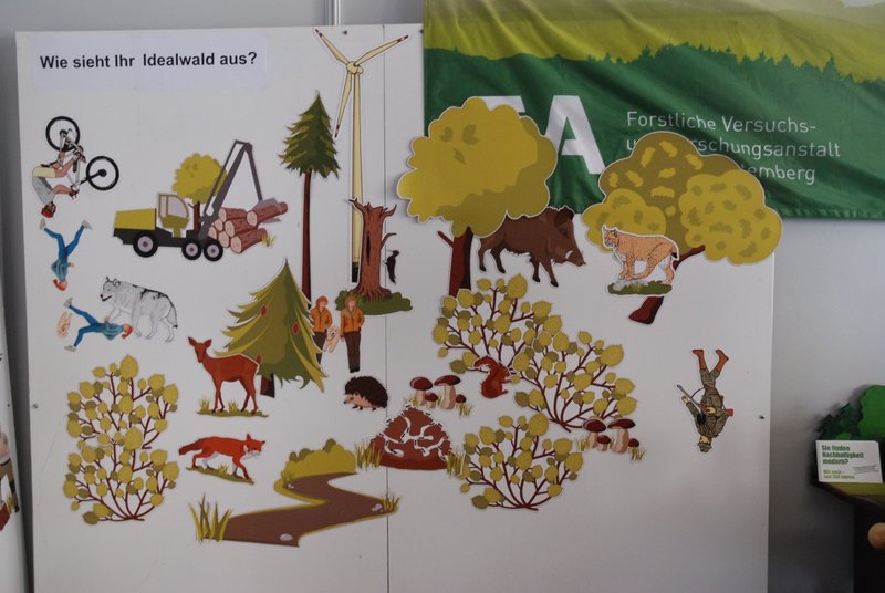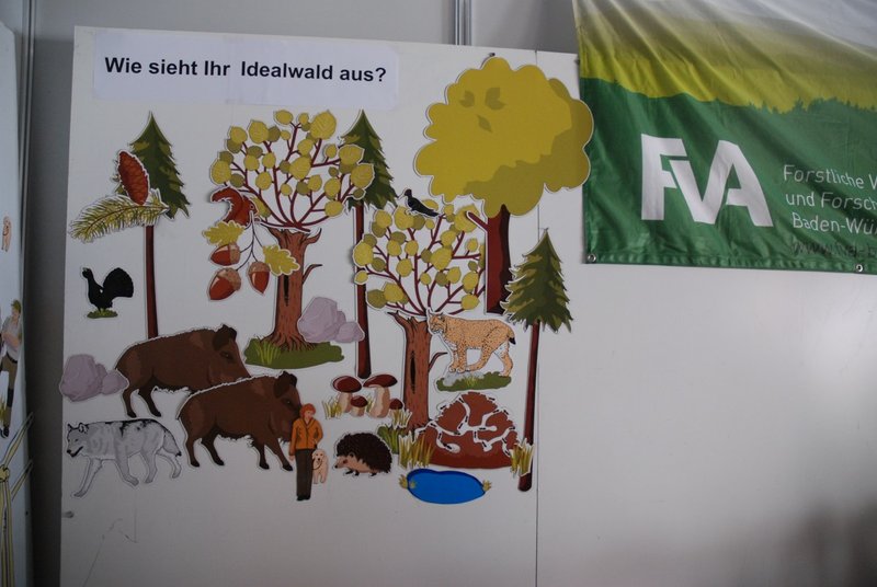 Die Abteilung Wald und Gesellschaft der FVA untersucht mit sozialwissenschaftlichen Methoden, was die Bedürfnisse der Bevölkerung in Bezug auf Wald sind. Erforscht wird, wie eine bedürfnisgerechte, nachhaltige Waldbewirtschaftung gestaltet und kommuniziert werden kann. Um sich mit einem Aktionsstand auf dem Wissenschaftsmarkt auf zugängliche Weise zu präsentieren, wurden eine Magnetwand sowie die dazugehörigen Figuren von PEFC Deutschland e. V. ausgeliehen und um einige Figuren erweitert, die potentiell kontroverse Themen wie Windenergie, Mountainbiken, Wolf und Jagd abbilden. Auf die Frage "Wie sieht Ihr Idealwald aus?" konnten die Teilnehmenden Figuren auswählen und auf der leeren Wand ihr individuelles Waldbild kreieren. Sie sprachen danach mit den Standbetreuern und füllten einen kurzen Fragebogen aus. Zum Schluss durften die Teilnehmenden ihr Bild vom Wald als ausgedrucktes Foto mit nach Hause nehmen. Die Gespräche rund um die Bilder und den Stand wurden gleich im Anschluss in Gedächtnisprotokollen dokumentiert. An der Aktion haben sich an zwei Tagen 64 Personen zwischen 5 und 78 Jahren mit einem eigenen Bild beteiligt; viele mehr sind mit den Standbetreuenden ins Gespräch gekommen. Die überwiegende Mehrheit der Teilnehmenden geht laut eigenen Angaben einmal oder mehrmals pro Woche in den Wald. Man kann also mutmaßen, dass mit dieser Methode eher Personen aktiviert werden, die schon ein Interesse am Wald und an Waldthemen mitbringen. Allerdings halten sich zwei Drittel der Baden-Württemberger zumindest im Sommer tatsächlich so häufig im Wald auf, weit mehr als im bundesdeutschen Durchschnitt. Insgesamt lässt sich als erfreuliches Ergebnis festhalten, dass Menschen aller Altersklassen und Bildungsschichten dafür gewonnen wurden, der FVA ihre persönliche Sicht auf den Wald zu visualisieren. Die Tafel war ein geeignetes Medium, um mit unterschiedlichen Menschen in den Austausch zu kommen.