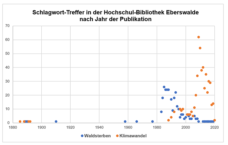 Abb. 2: Verteilung der Publikationsjahre der Schlagworte Waldsterben bzw. Klimawandel in der Hochschul-Bibliothek Eberswalde (eigene Darstellung).